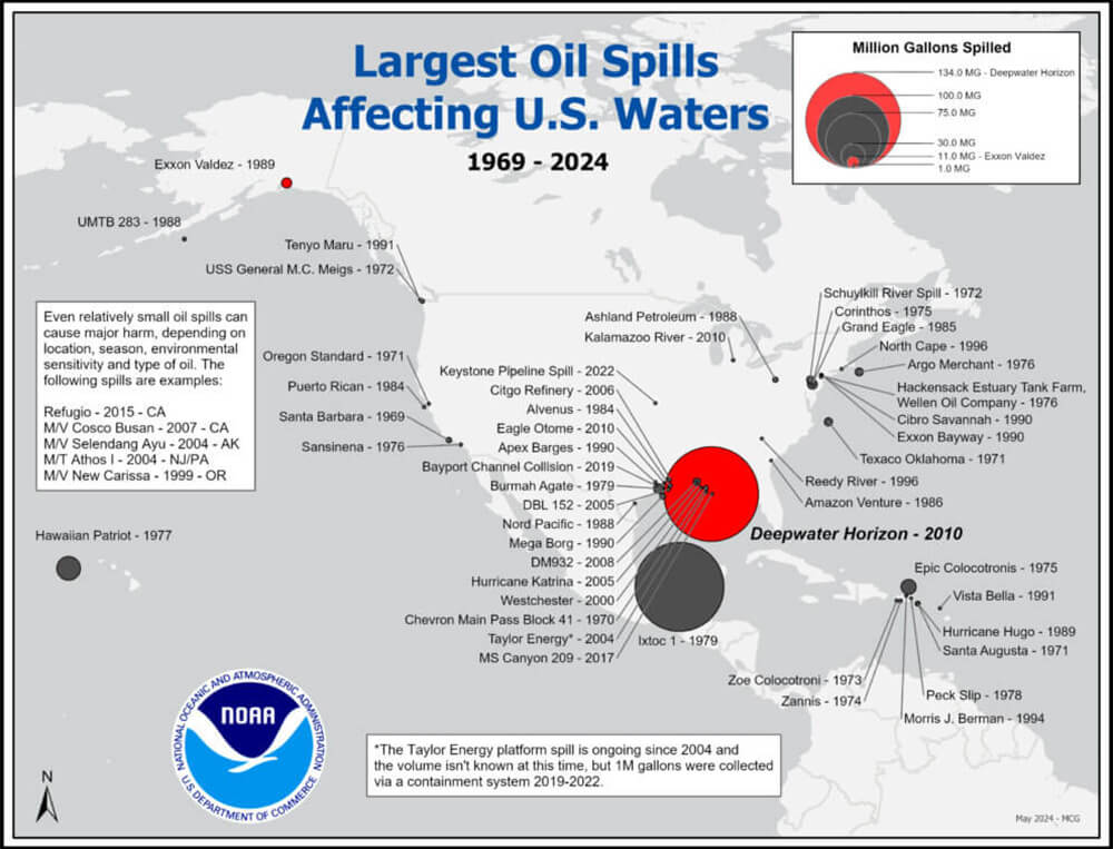 The largest oil spills that affected U.S. waters since 1969-2024. Source: Office of Response and Restoration.