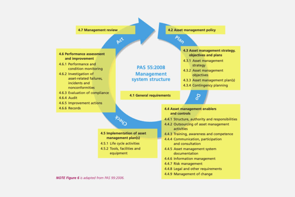 PAS 55 defines 28 explicit requirements, listed across 6 categories, within the quality management Plan-Do-Check-Act (PDCA) framework: