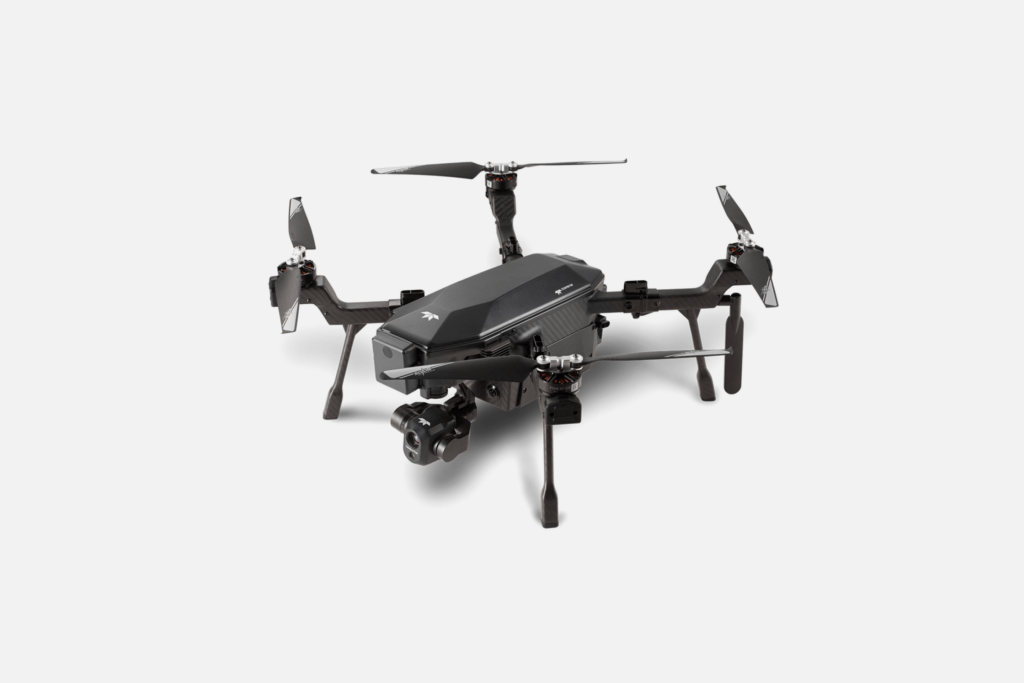 The Ranger Pro quadcopter from Wispr is another popular choice for drone power line inspection. Built with carbon fiber and aluminum, the drone is lightweight (17lb/7.7kg with battery) and durable, resisting winds of up to 50 mph/22.35m/s. The 25000 mAh battery offers 18-45 minutes of flight time, subject to payload weight.