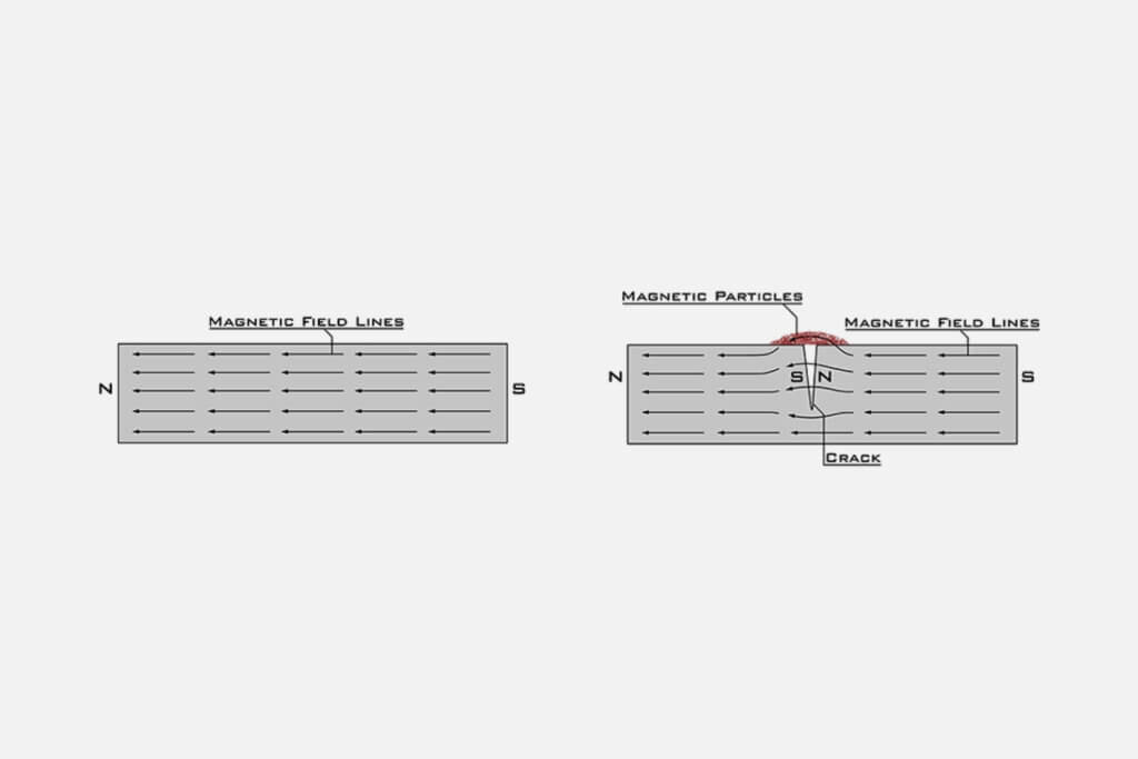 Defect present: The crack causes the magnetic flux to divert from its path. This creates a separate flux leakage field with greater magnetic power than defect-free areas.