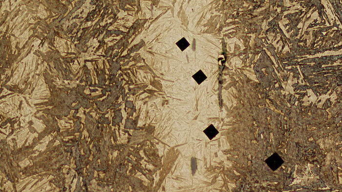 Vickers hardness testing uses a pyramid-shaped diamond indenter to produce either macro or micro indents. Suitable for all materials, it provides qualitative data on the hardness of metallic components, welds, ceramics, and coatings.
